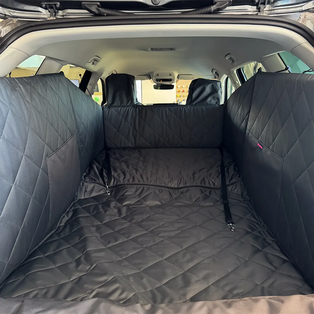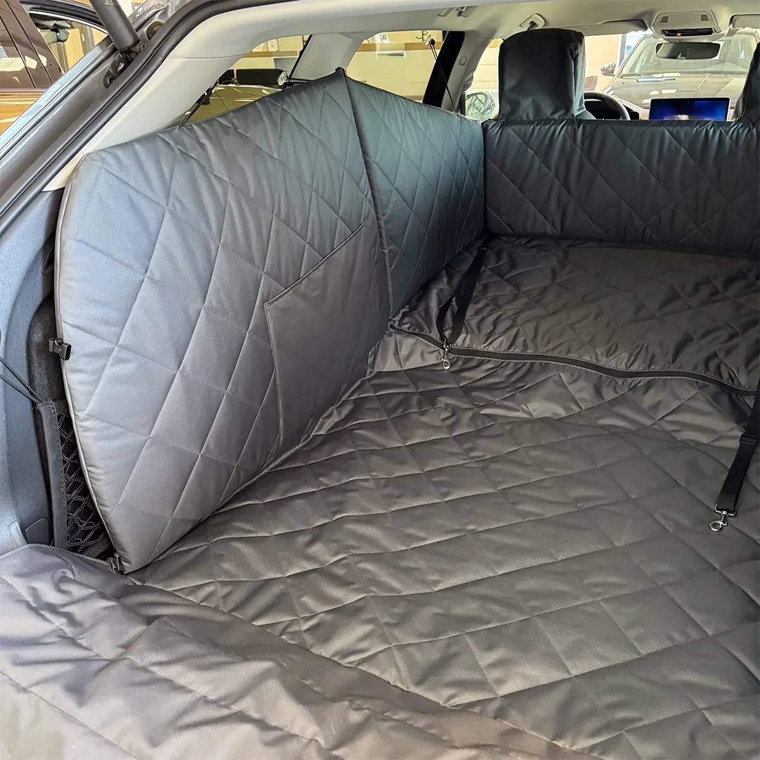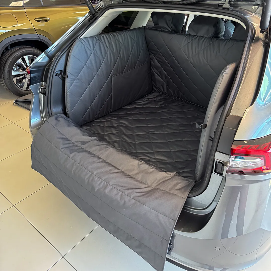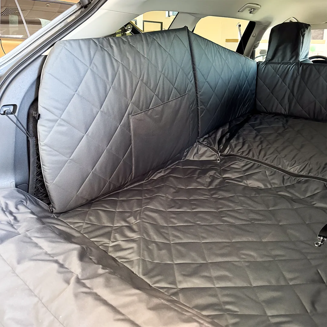 Modułowa zabudowa bagażnika z ochroną zderzaka to zapewnienie komfortu w podróży z psem, a także czystości w bagażniku. Chroni nie tylko podłogę bagażnika, lecz sprawia, że ściany boczne oraz oparcie tylnej kanapy pozostają czyste. Dzięki niej sierść nie wbija się w tapicerkę i chroni przed wszelkimi uszkodzeniami lub zadrapaniami możliwie spowodowanymi przez pupila. Materiały używane do szycia maty posiadają wodoodporną powłokę, która zapewnia zatrzymanie cieczy na powierzchni.