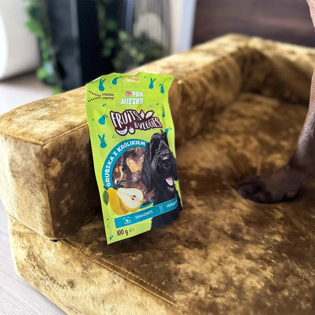 Twój pies lubi niebanalne połączenia smaków? Z pewnością pokocha aromatyczne przysmaki Pan Mięsko FRUITS & VEGGIES! Owoce i warzywa zawinięte w pyszne kawałki mięs to prawdziwa uczta dla podniebienia. Przysmaki to świetna nagroda podczas treningu, ale także pomysł na przekąskę między posiłkami Twojego pupila.