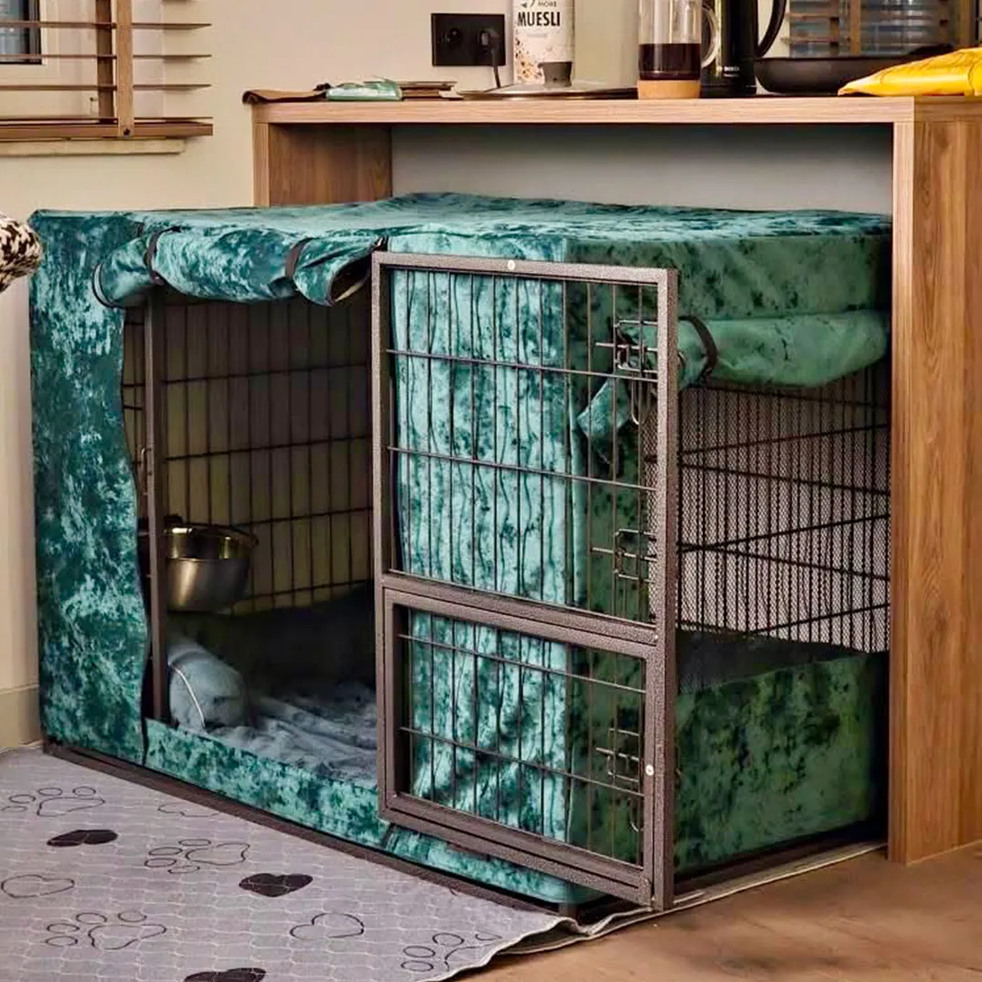Pokrowiec na kennel szyjemy na wymiar klatki. Dostępny w różnych tkaninach, kolorach i wzorach, aby idealnie dopasować go do stylu Twojego domu.